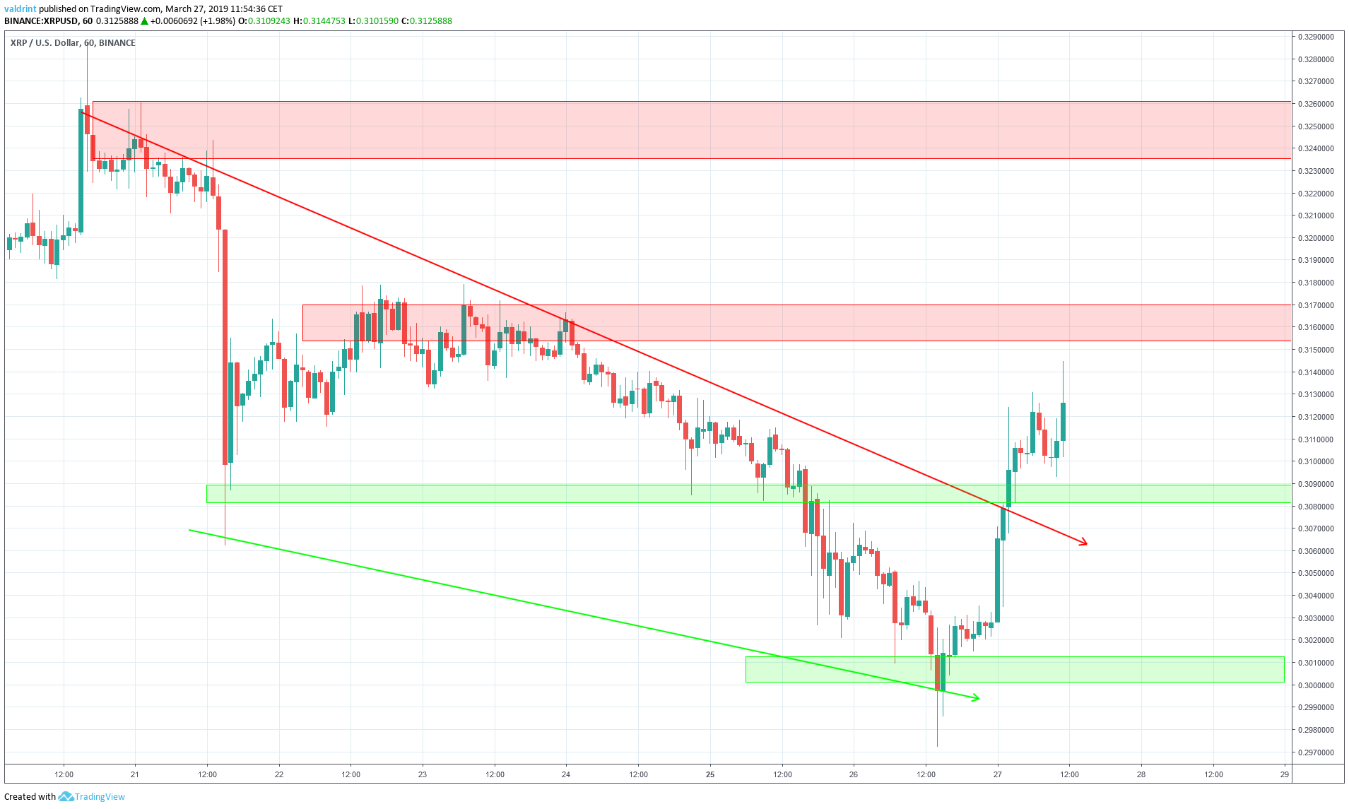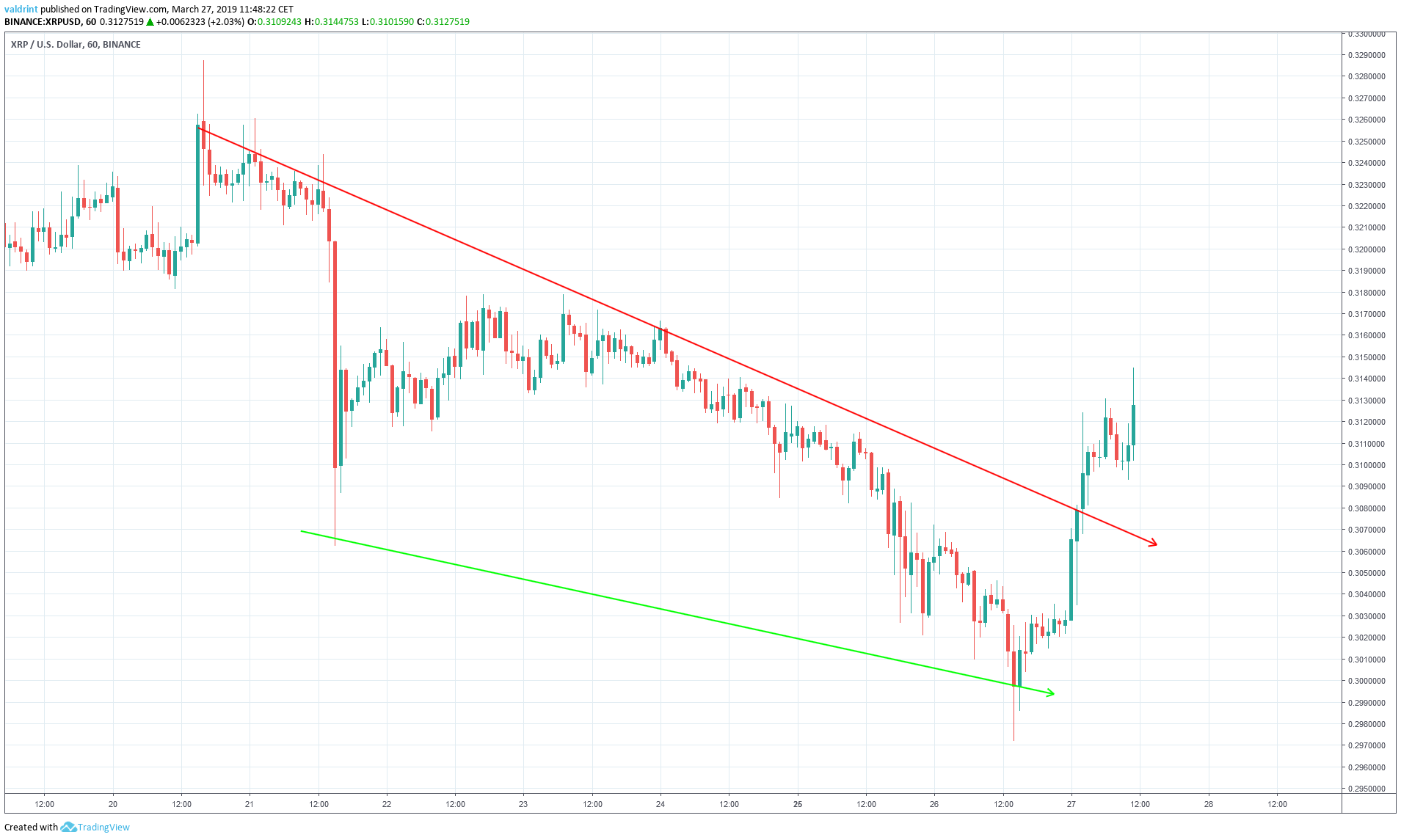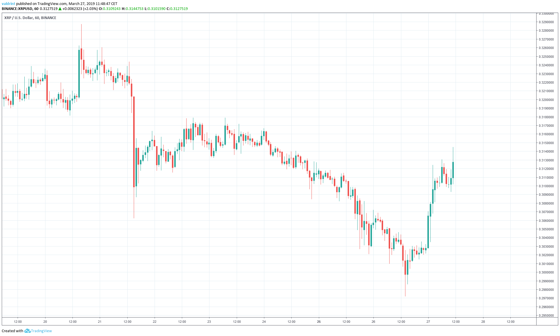 On Mar 27, the price made a high of $0.312. It proceeded to make another high of $0.315 later in the day.