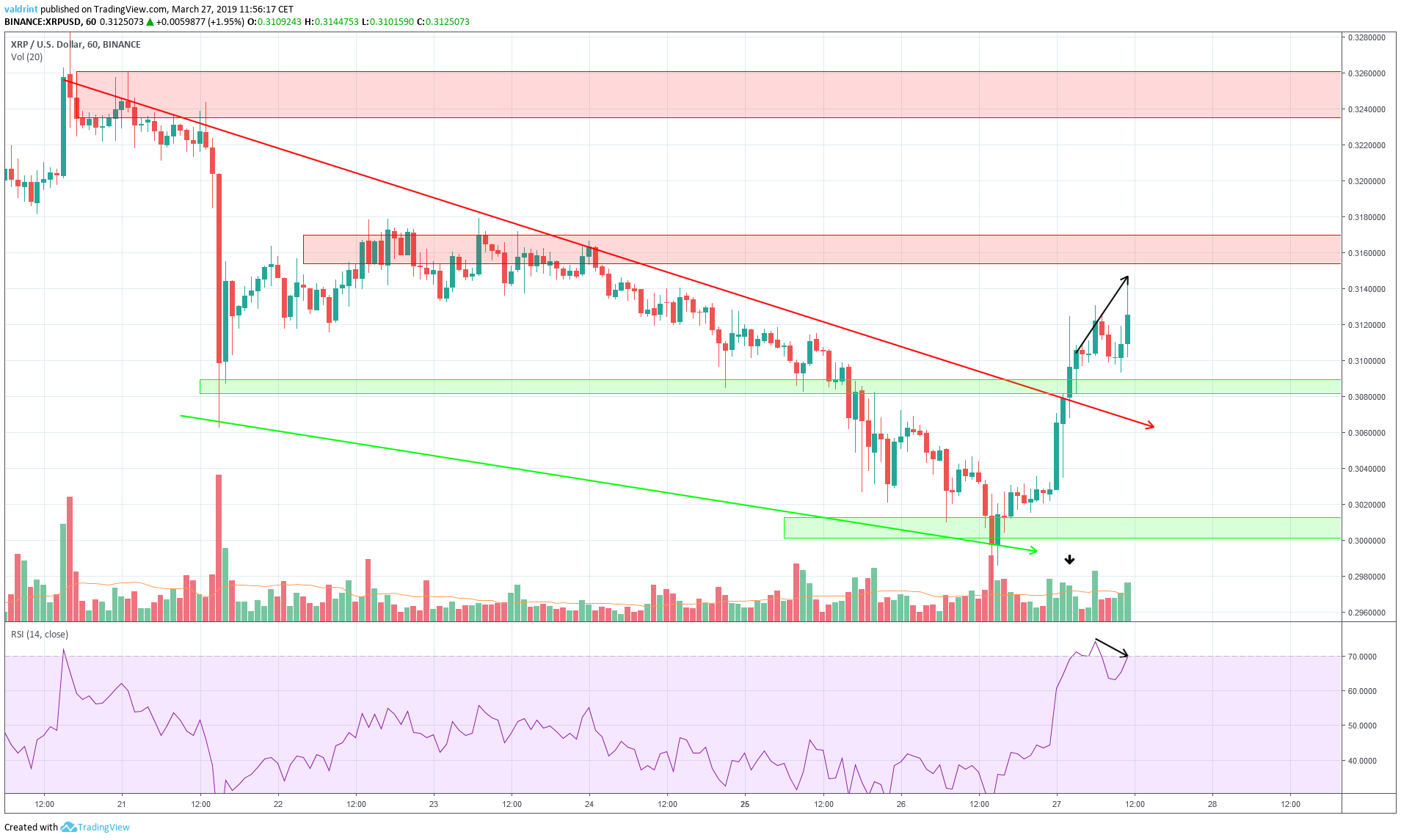 Sponsored SponsoredThere are two visible resistance areas, near $0.325 and $0.317. In case the price continues to increase, XRP may reach values around $0.317. However, is less likely that price would continue to rise to $0.325 before a subsequent drop.