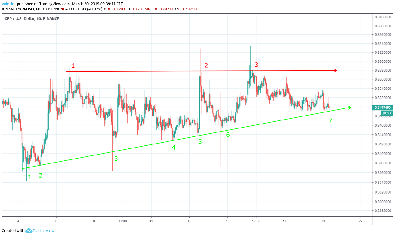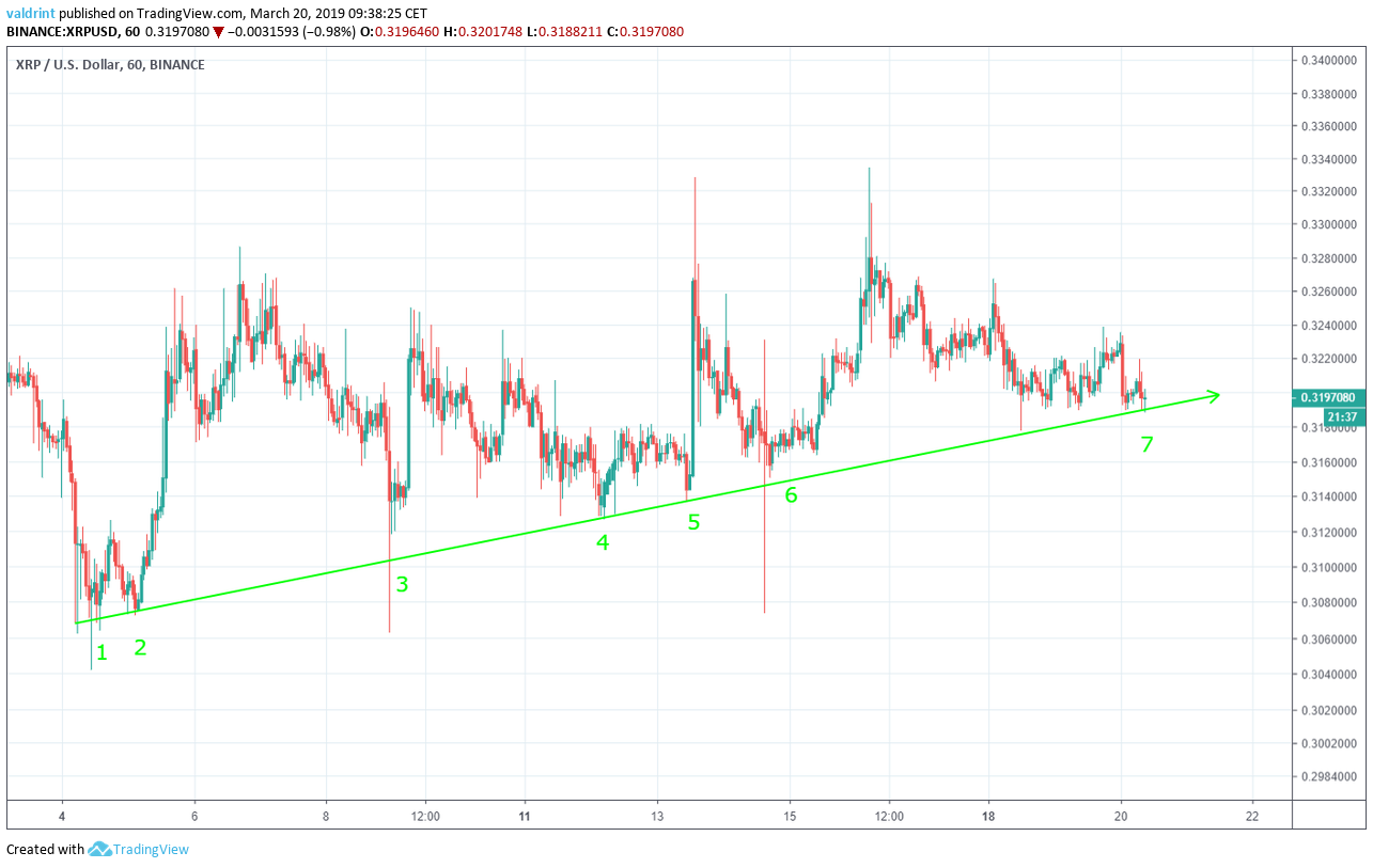 The price of XRP has been increasing at the same rate as predicted by the support line since Mar 4.