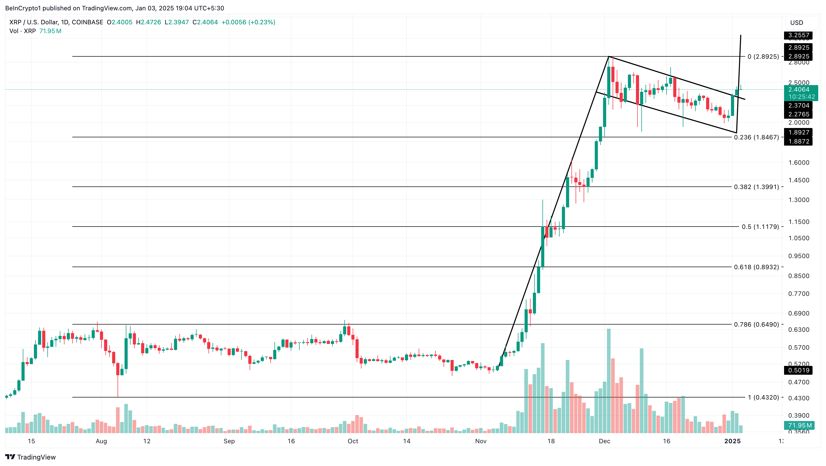 Typically, this pattern acts as a bullish continuation, anticipating further price increases driven by sustained trading volume. Therefore, if XRP sees an increase in buying pressure and its volume continues to rise, the price might rally to $3.25.