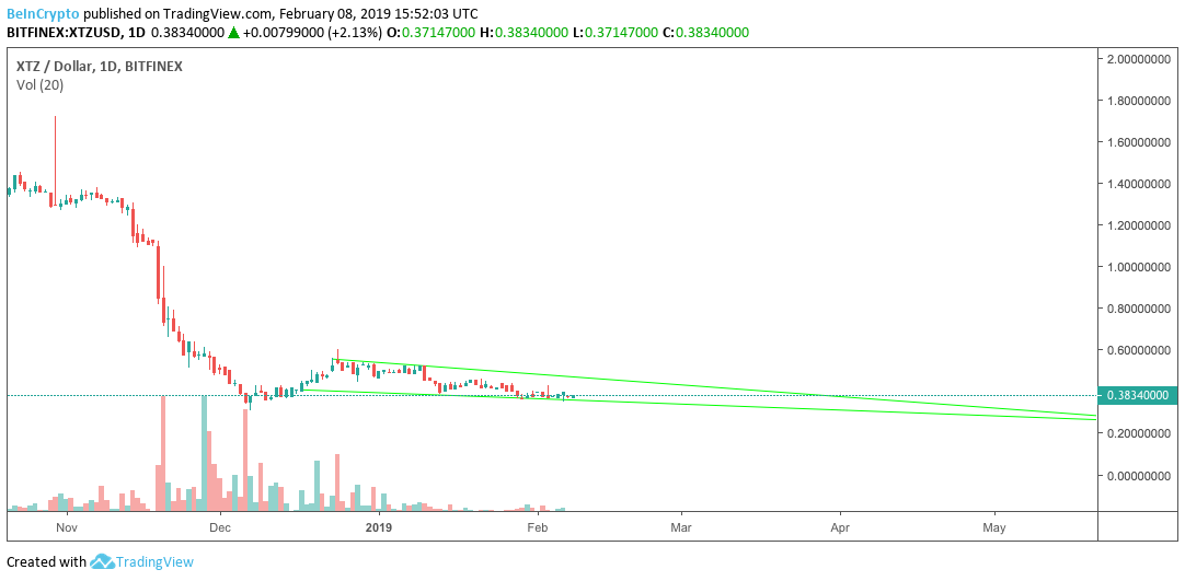 As of February 2019, XTZ appears to be consolidating around $0.37, after previously touching this value in early December 2018. Whether it breaks up or down after consolidation remains to be seen, but previous movements indicate XTZ is likely to continue falling after failing to hold $0.37.