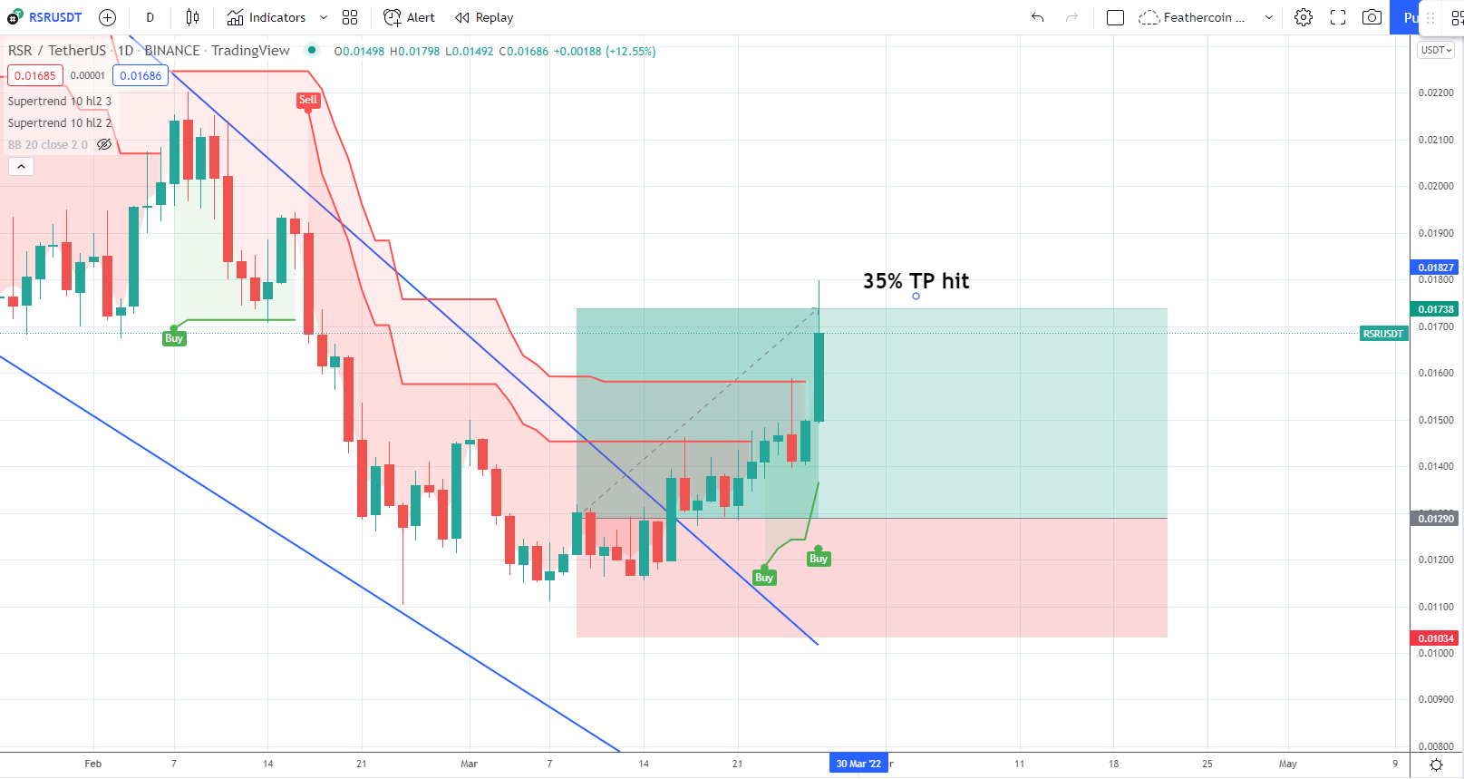 Cryptocurrency trader @Incomesharks tweeted a chart of RSR, stating that the price has increased by more than 30% since his entry.