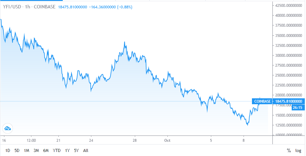 As the chart below shows, the Sept. 29 EMN hack coincides strongly with another sharp fall in YFI during a strange September that was both bullish and bearish. The token shed 67 percent of its value from its Sept. 12 all-time high of $43,000 to just over $12,500.