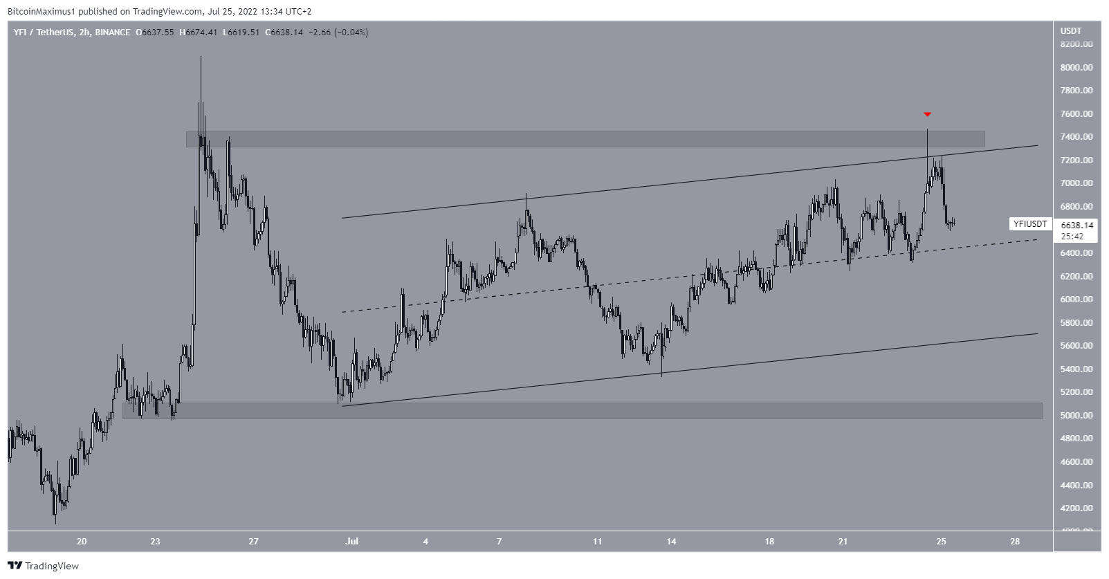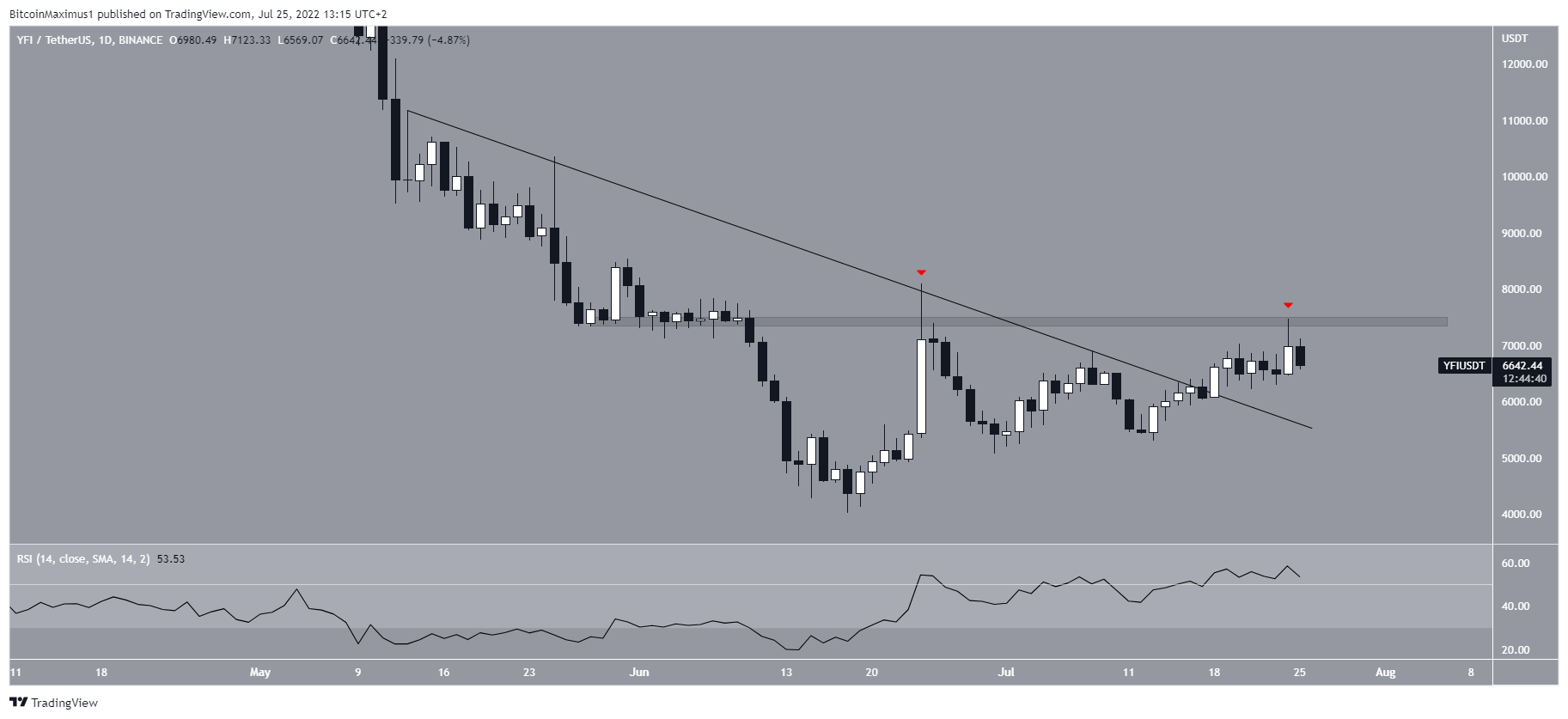 The daily chart shows that YFI broke out from a descending resistance line that was in place since May 9. Afterward, it proceeded to reach a high of $7,461 but was rejected by the $7,400 horizontal resistance area (red icon), creating a long upper wick.Â