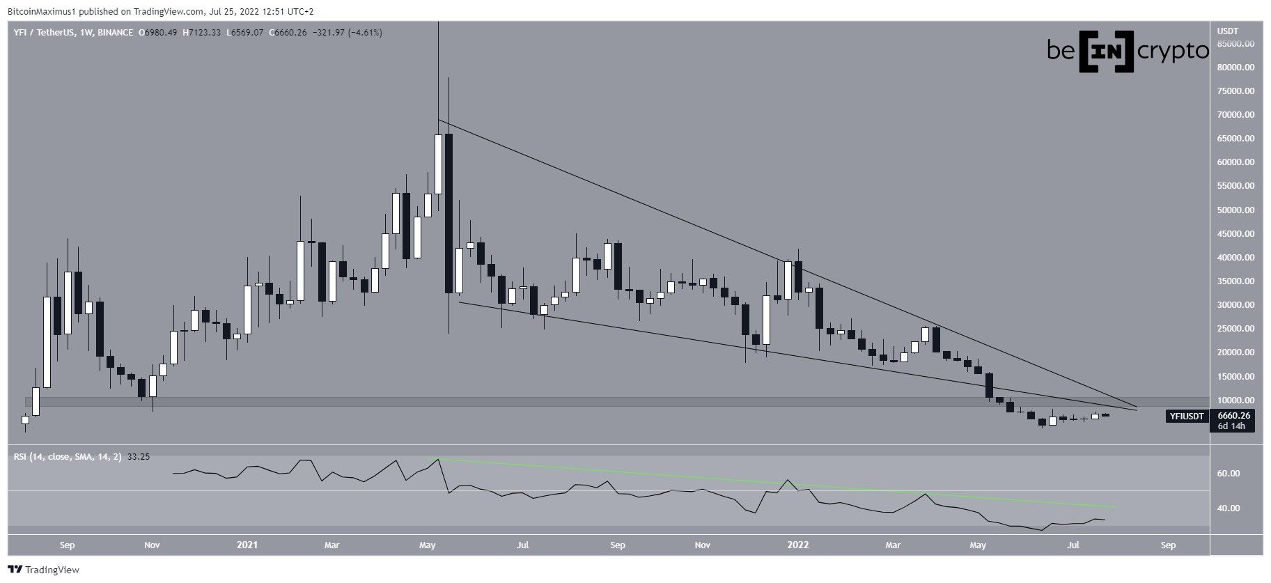 YFI has been falling since reaching an all-time high price of $95,000 in May 2021. Initially, the downward movement was contained inside a descending wedge, which is considered a bullish pattern.Â