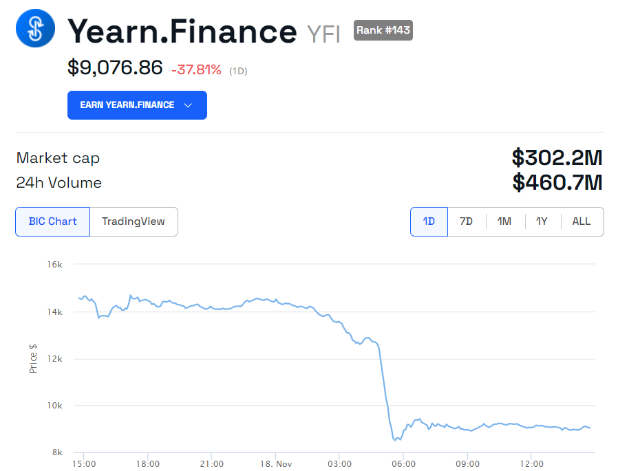The sudden sell-off resulted in Yearn Finance’s market cap dropping by approximately $200 million, from $482 million to $296 million.