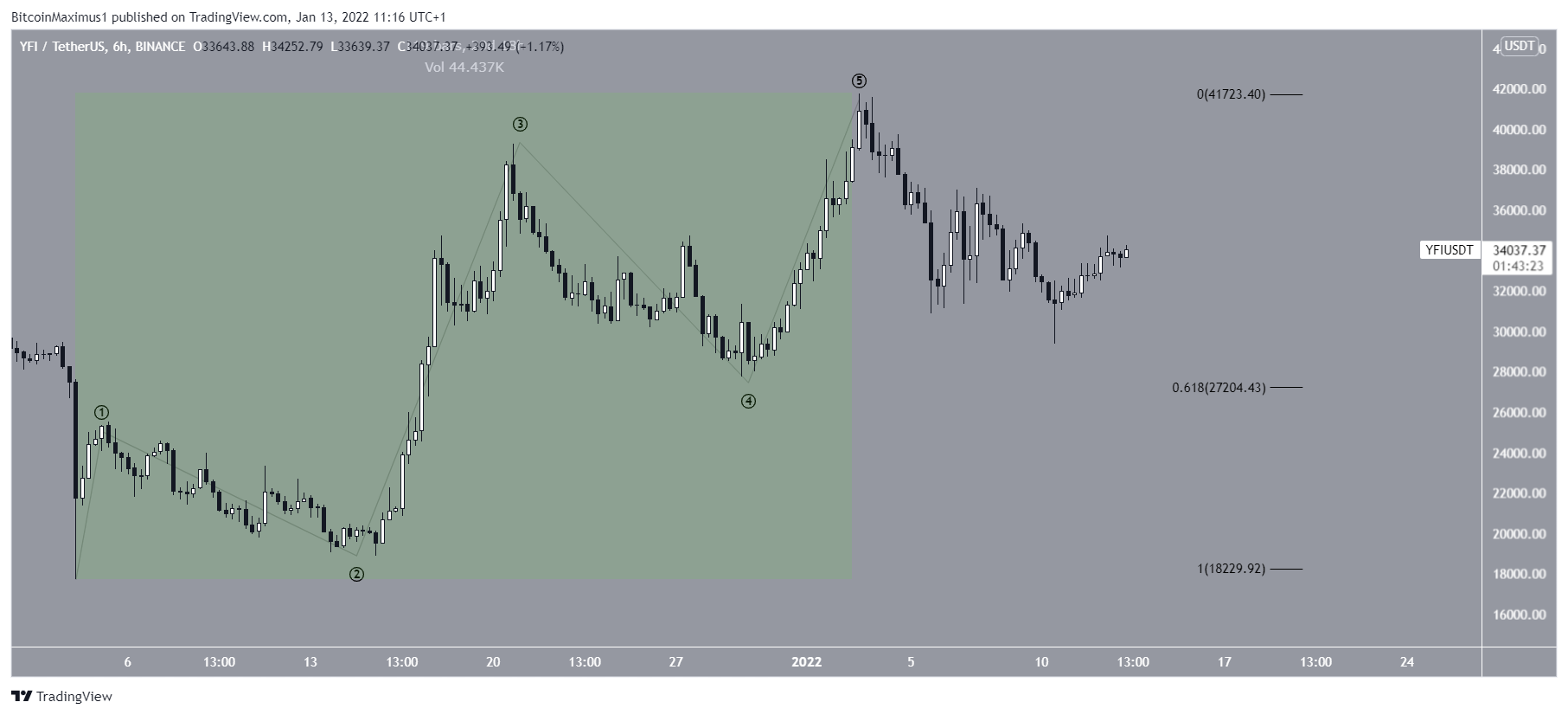 The increase since Dec 4 (highlighted) appears to have taken the shape of a five-wave upward move. If true, YFI is now correcting.Â