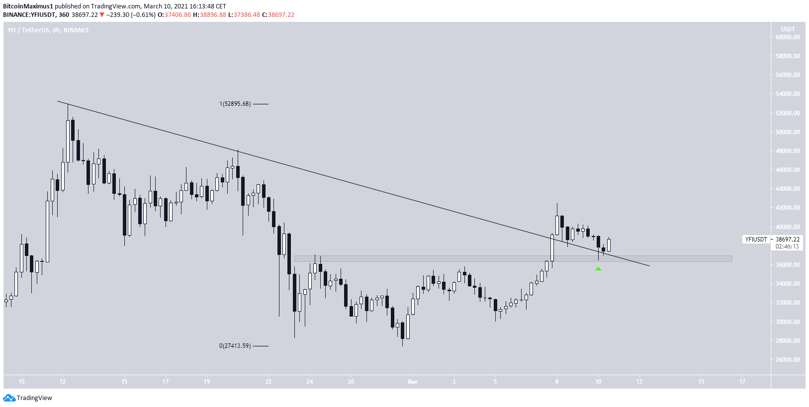 Sponsored SponsoredThis does seem likely when looking at the six-hour chart, which shows that YFI has broken out from a descending resistance line. Furthermore, it has reclaimed the $36,600 area.
