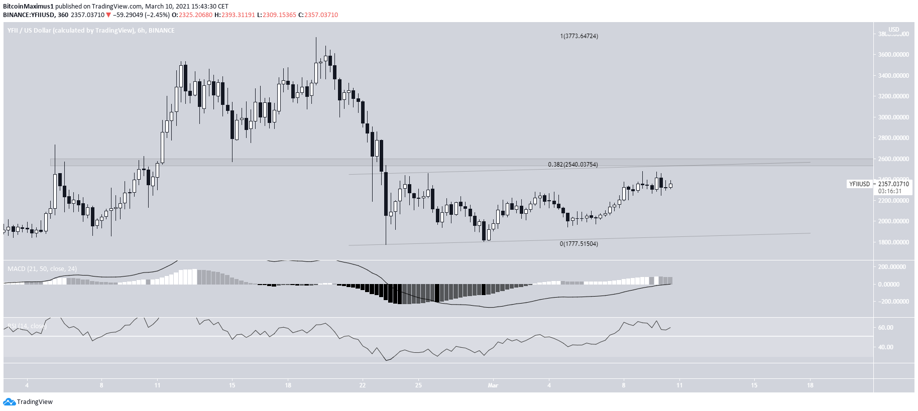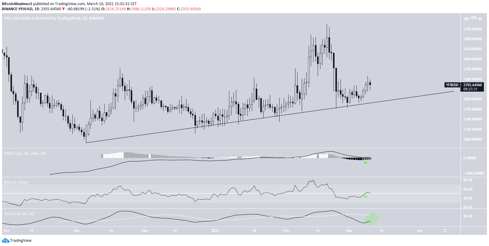YFII has been following an ascending support line since Nov. 2020. Most recently, the line served to stop the decrease beginning on Feb. 19, 2021, creating a long lower wick in the process.