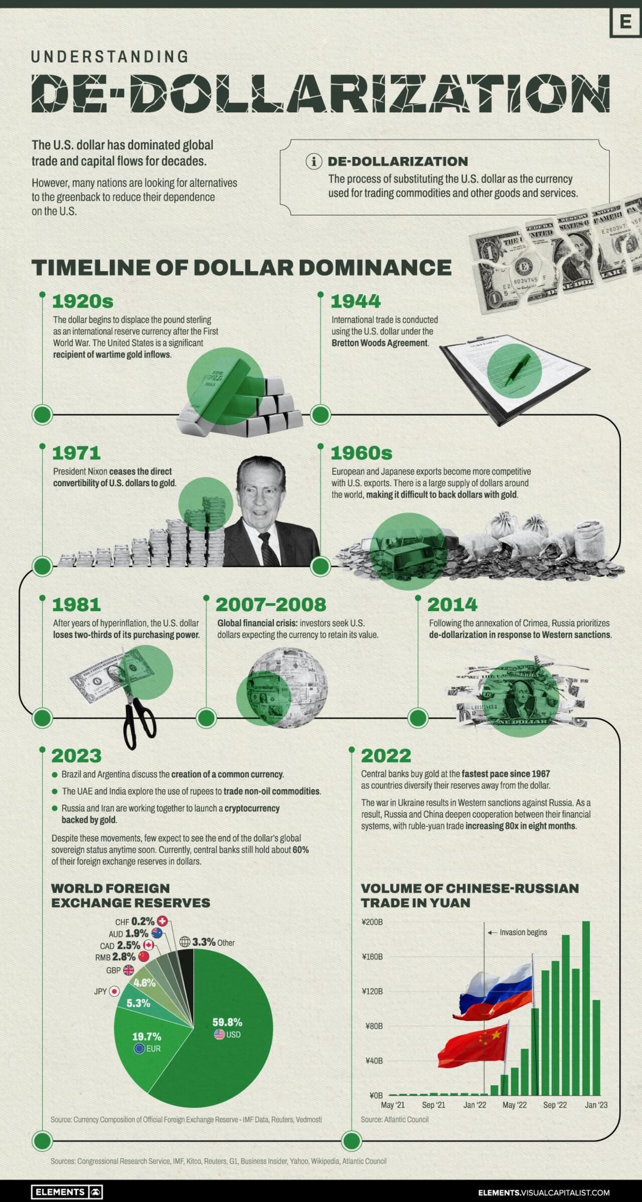 However, central banks still hold about 60% of their foreign exchange reserves in dollars, according to Visual Capitalist.