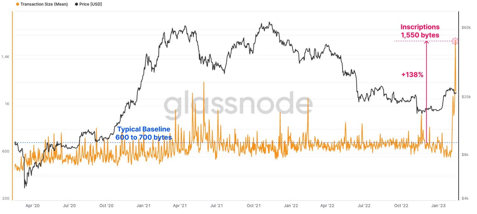 Ordinals have indeed made everyone take a closer look at the Bitcoin network. Since the explosion in popularity, the mean size of transactions, for example, has increased by over 100% to 1100 bytes.