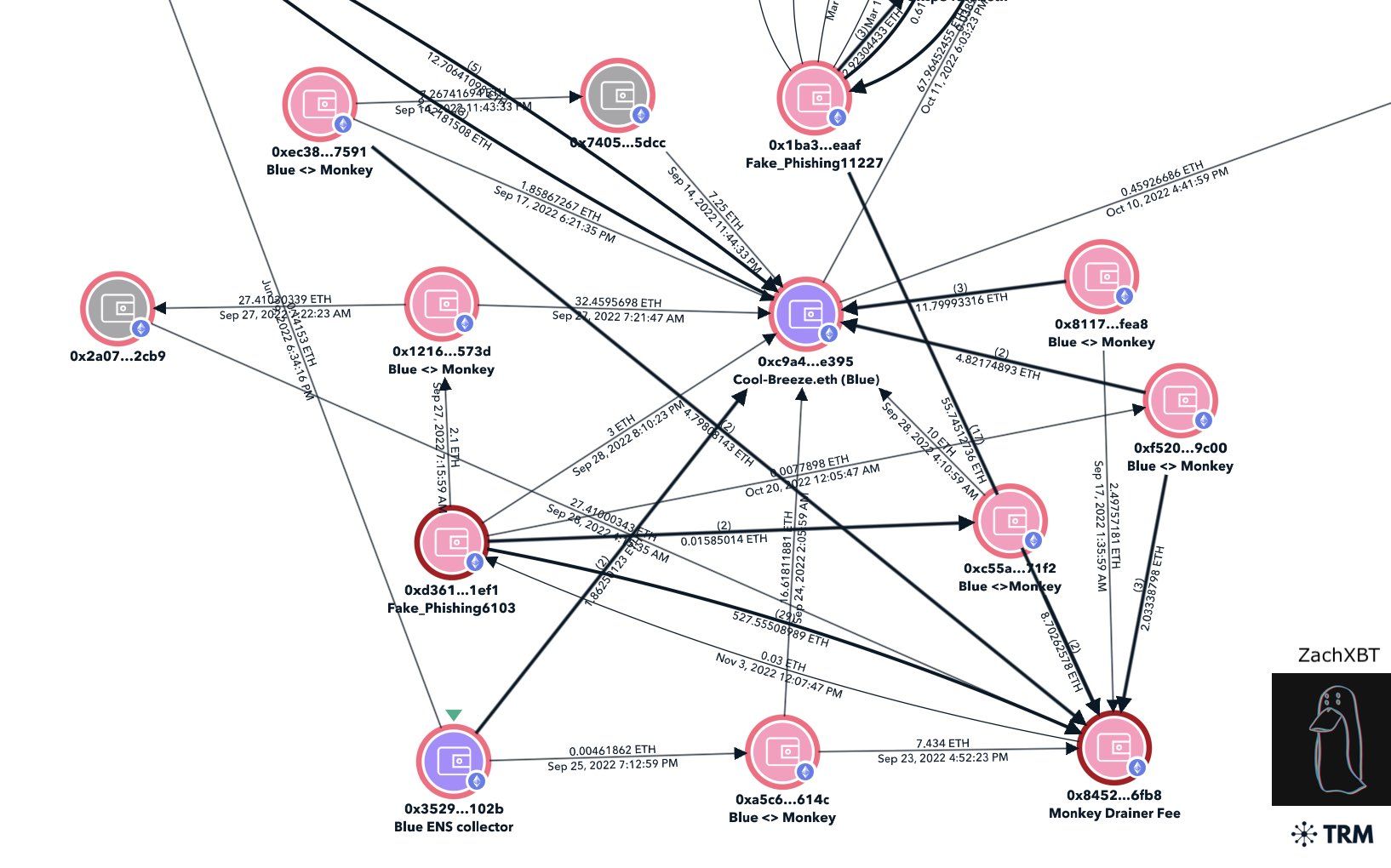ZachXBT then noticed inflows topping 85 ETH. This amount represents approximately a third of the stolen funds. One can trace it back to addresses associated with Monkey Drainer phishing scams.