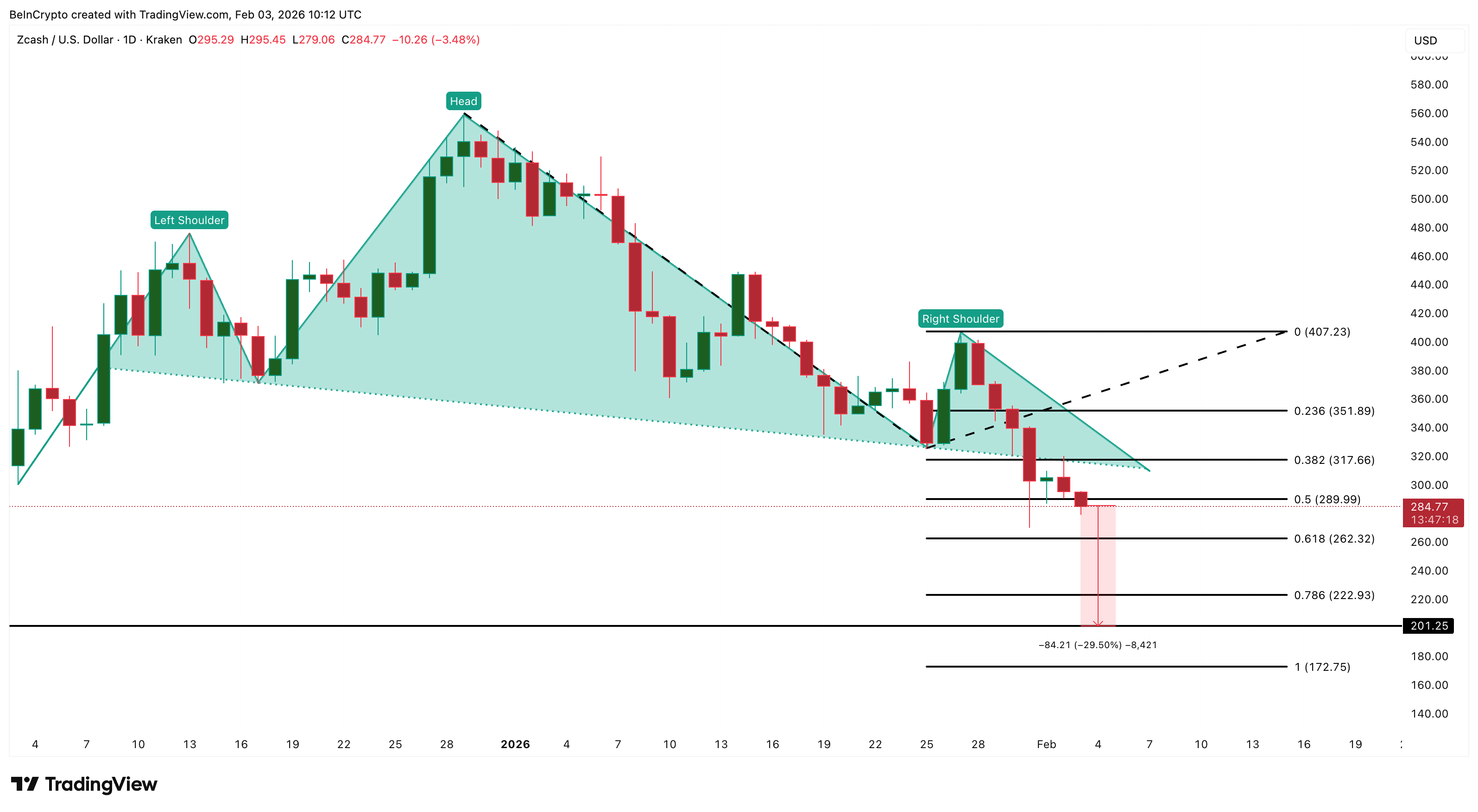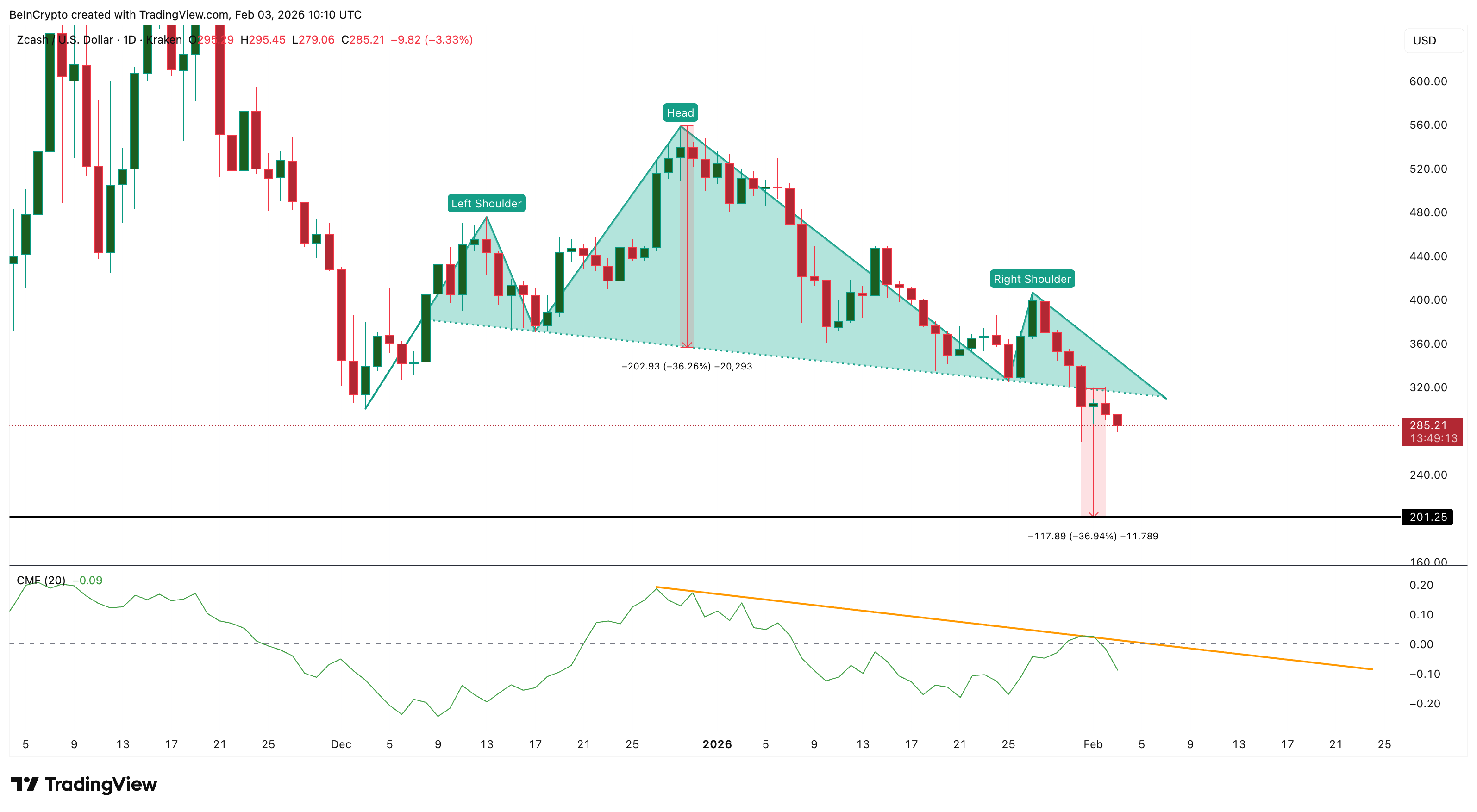Zcash’s current decline began with a clear technical breakdown in late January. On January 31, the token completed a head-and-shoulders pattern, a classic bearish formation that often signals trend reversals. Since then, the ZEC price has consistently respected the breakdown structure.