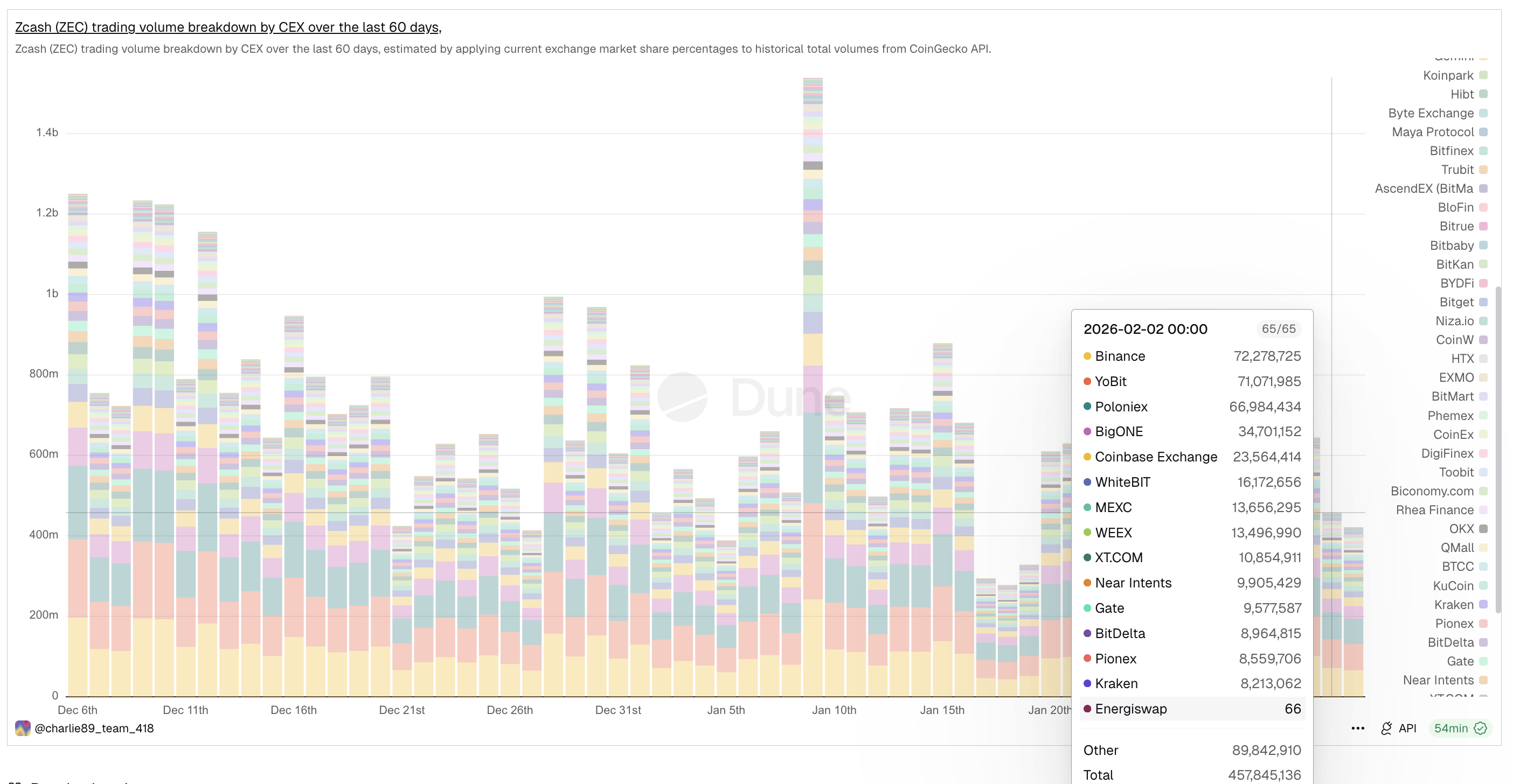 At the same time, trading activity has collapsed. Dune data shows that Zcash’s total centralized exchange volume peaked on January 9. On that day, the combined daily volume crossed $1.5 billion. By February 2, daily volume had dropped to around $450 million. This represents a decline of roughly 70% in just three weeks.