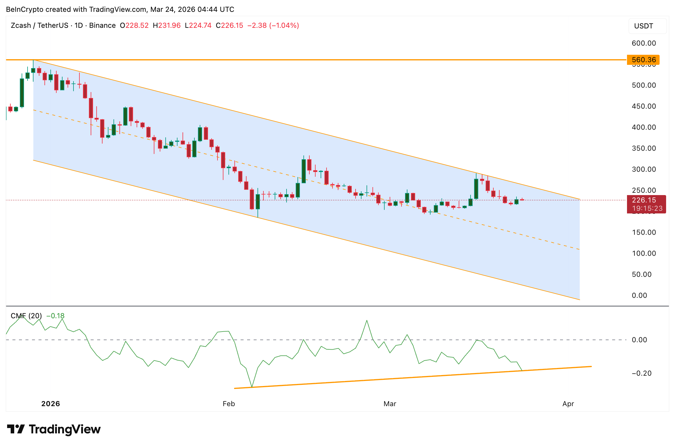 It attempted to cross above the zero line on March 16 and failed. Since then, it has been trending lower and is now nearing a breakdown of its own ascending trendline. If the CMF breaks down, it would confirm that larger spot participants are pulling capital out rather than supporting the ZEC price from underneath.