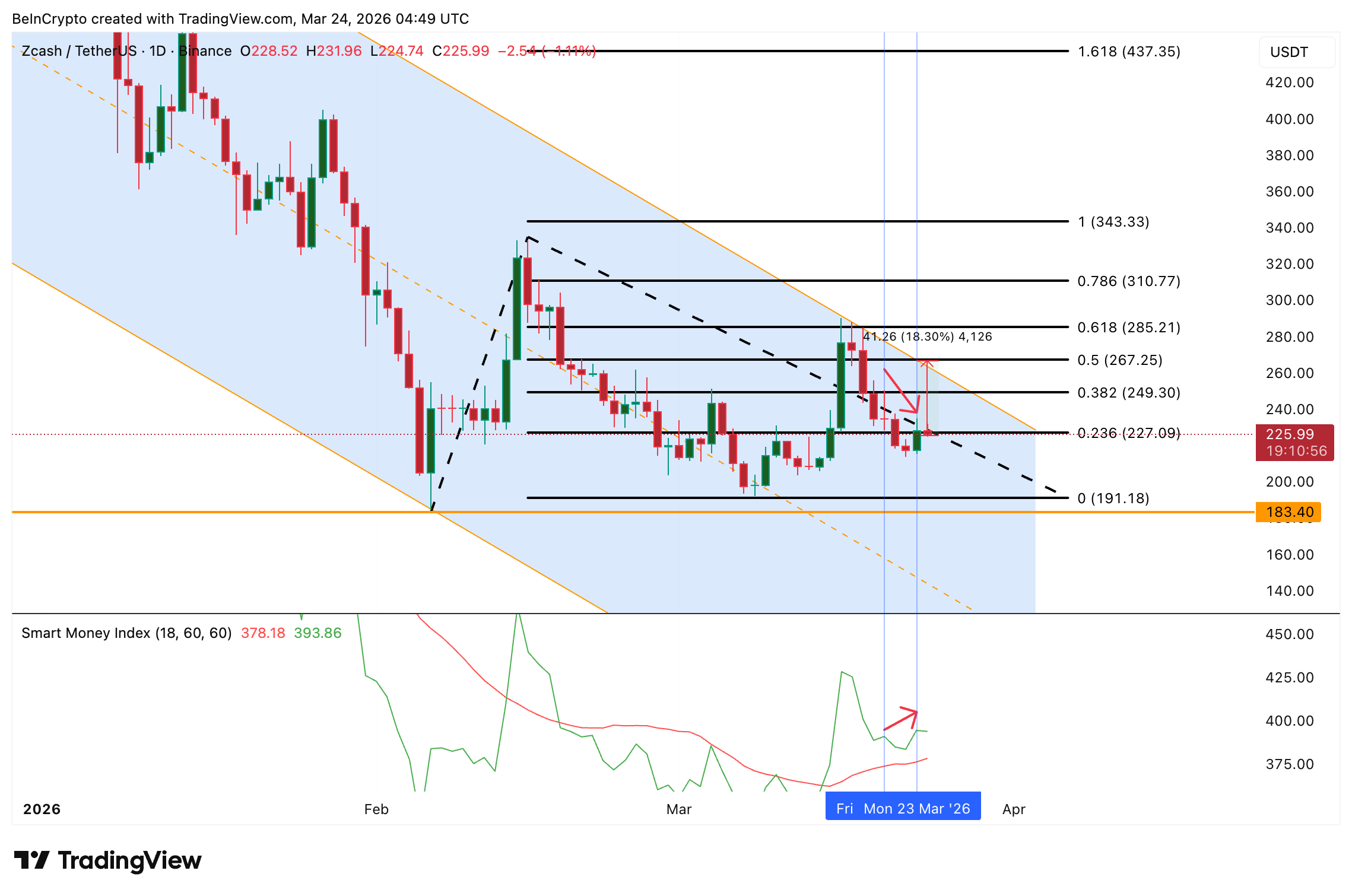 The Smart Money Index (SMI), an indicator tracking positioning by informed participants offers a counterargument to the fading CMF. The SMI remains above its signal line and has actually made a higher high between March 20 and March 23, while the Zcash price trended lower during the same period.