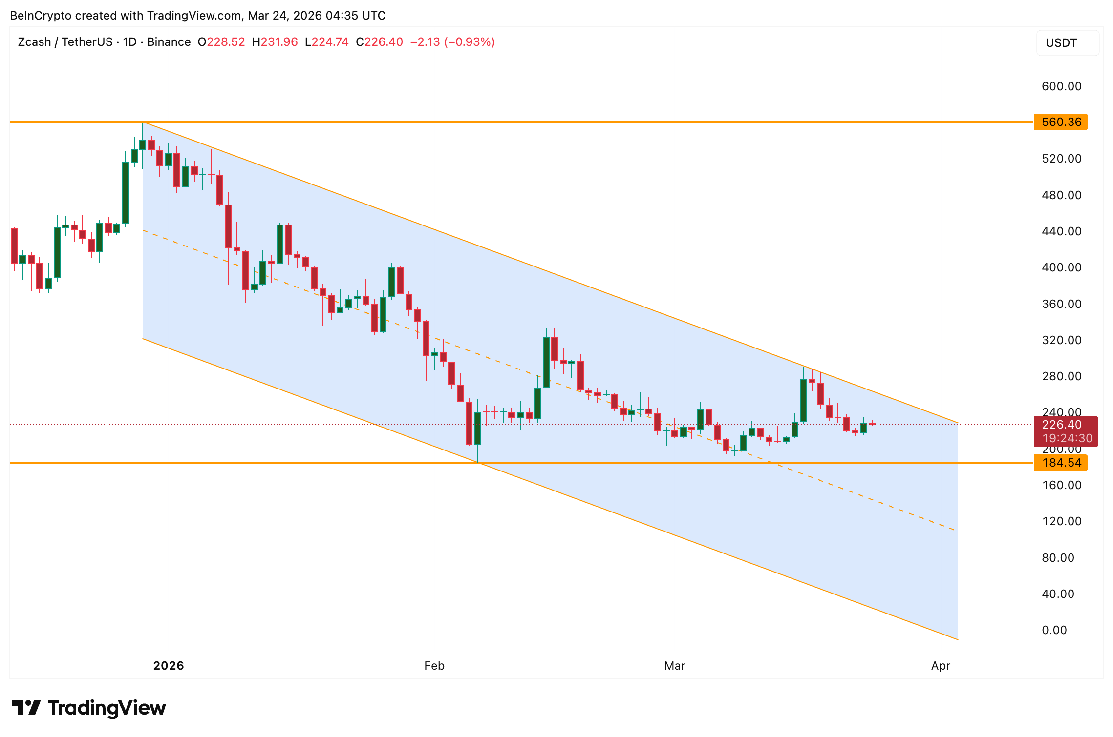 Zcash (ZEC) price trades near $226, still trapped inside a falling channel that has defined its structure since late December and contributed to a 55% year-to-date decline.