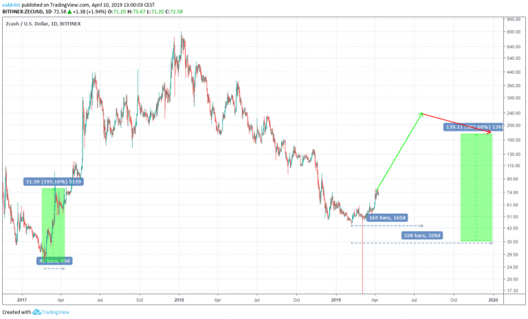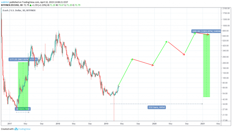 Since 2017, Zcash has experienced significant uptrend and downtrends. However, there is a pattern which we believe is likely to be repeated: