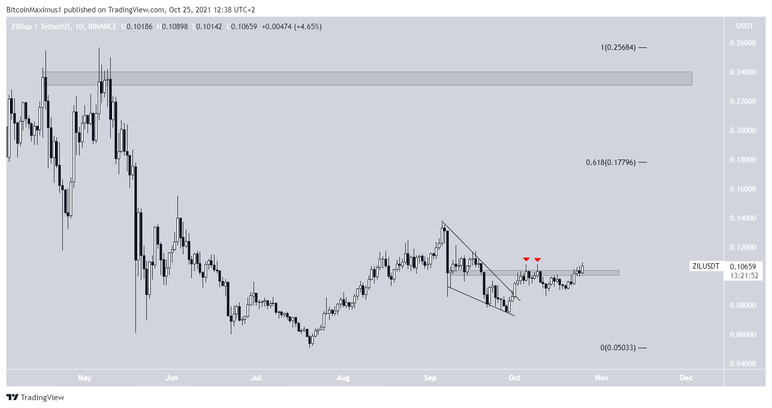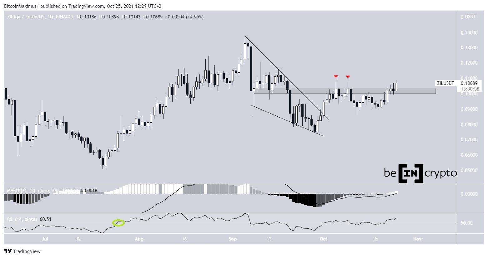 The daily chart shows that ZIL has been moving upwards since breaking out from a descending wedge on Oct 1. The wedge is considered a bullish pattern, meaning that a breakout is expected in the majority of cases.Â