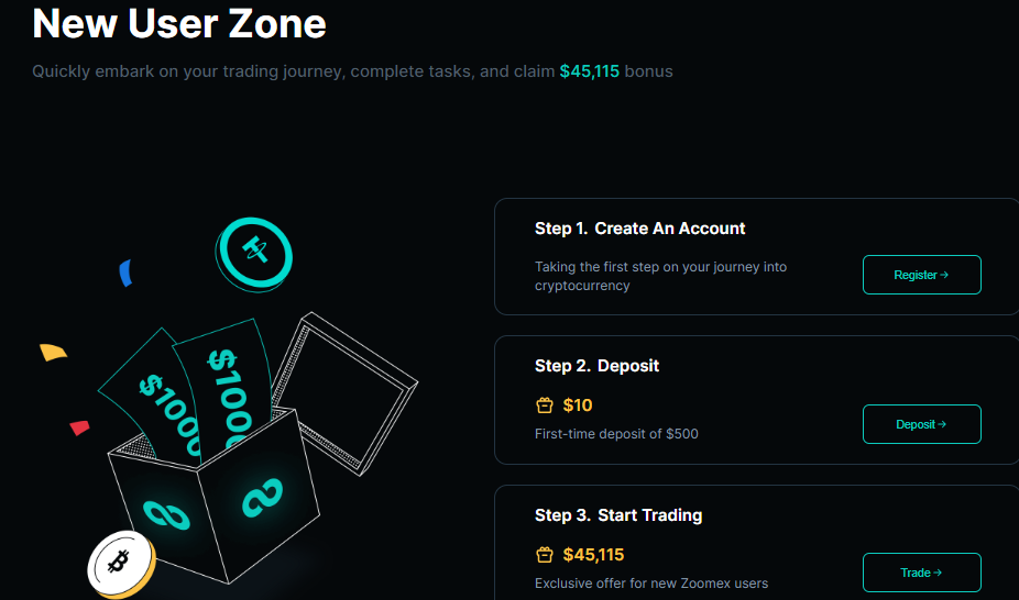 Opening an account and trading with Zoomex is quite simple. Users can sign up on their website using their email address or phone number. When they make a first-time deposit of $500, they are immediately rewarded with a $10 trading coupon. Moreover, when they start trading, they can earn up to 45,115 USDT in additional rewards.